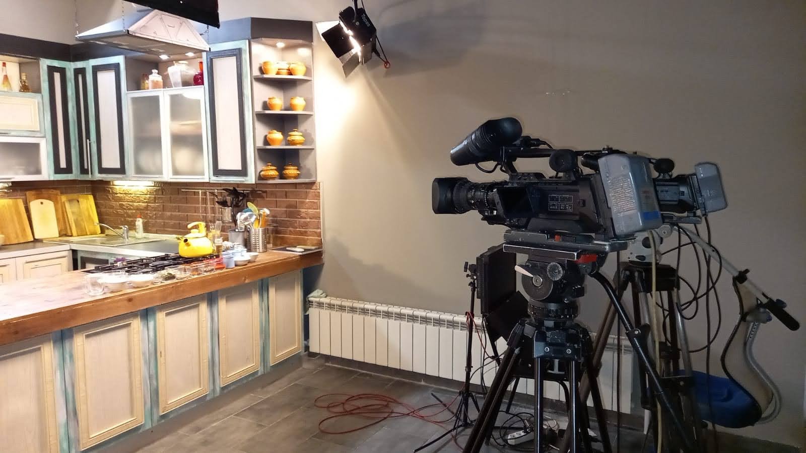 Ферма для крепления света по всему периметру. Полностью оборудованная кухня для съемок. Сменные декорации и различными фактурами. Сменные декорации-декорация кухни. Вся встроенная техника кухни в рабочем состоянии, варочная панель, духовка. Плюс, сменная декорация для съемок программы о дизайне, сменная декорация для съемок программ о строительстве и ремеслах.